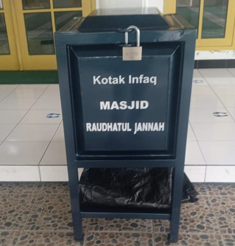 Kotak infak dari Masjid Raudlatul Jannah yang terbuat dari besi baca dengan pengaman gembok dan rantai. (Foto Istimewa)