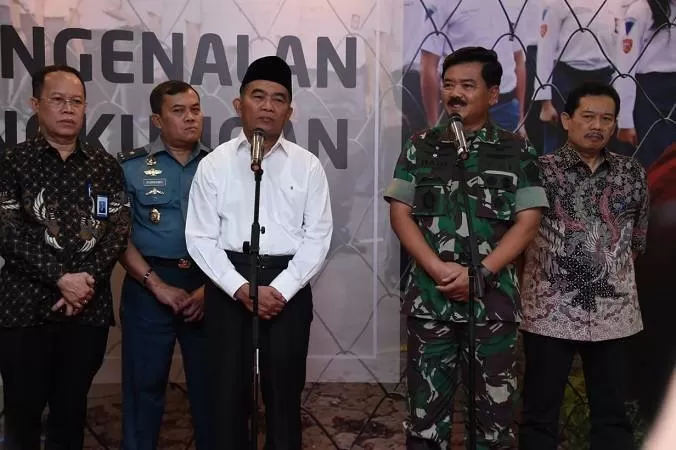 Panglima TNI Marsekal TNI Hadi Tjahjanto, S.I.P. didampingi Mendikbud Muhadjir Effendy dalam konferensi pers dengan awak media di Ruang Graham Utama Kemendikbud, Jakarta, Jumat (21/6/2019) mengatakan bahwa pihaknya (TNI) menyambut gembira program Pengenalan Lingkungan Sekolah (PLS) dan TNI siap mendukung dan membantu memberikan  materi PLS sesuai dengan program Kemendikbud RI.