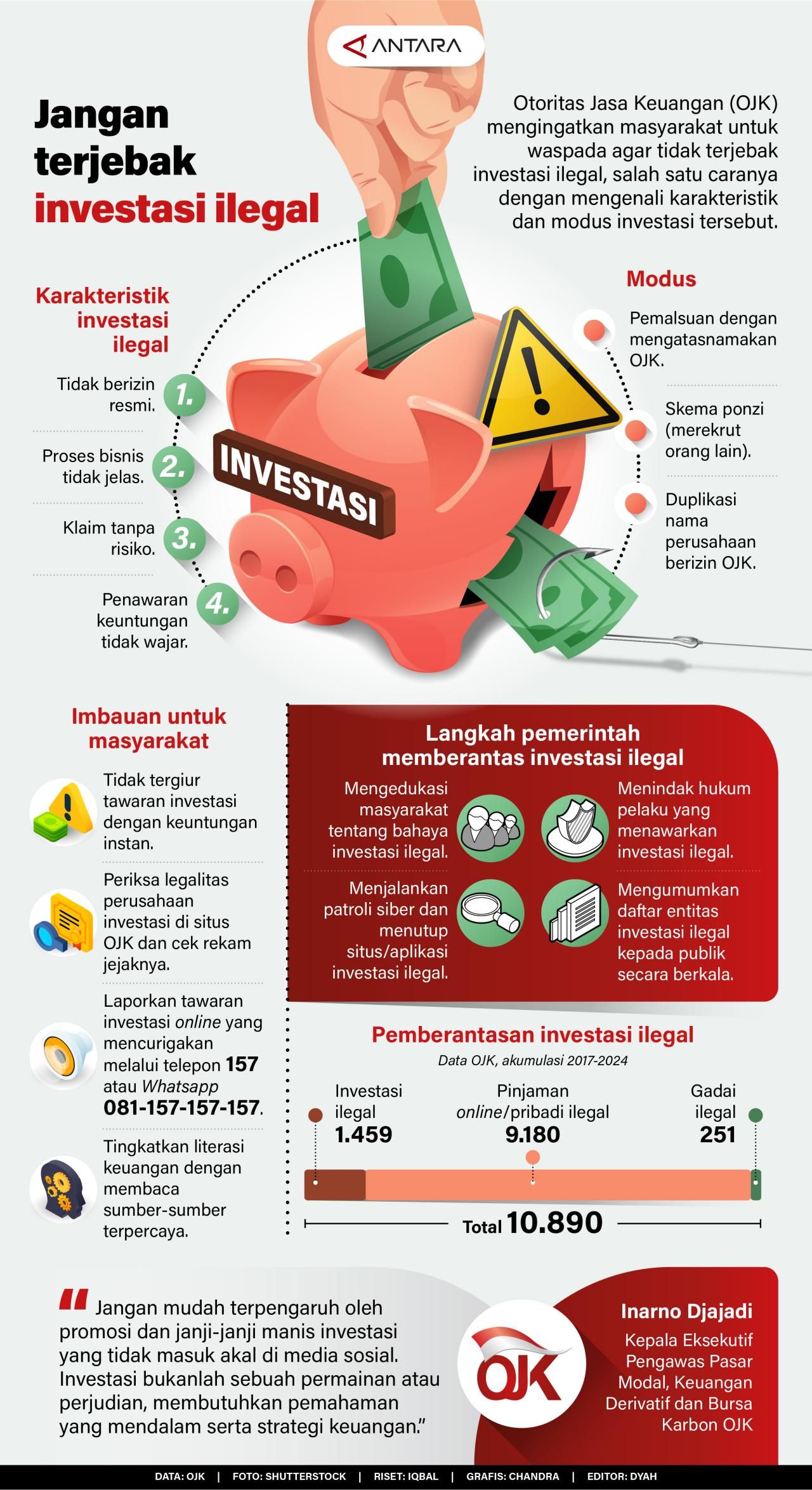 Otoritas Jasa Keuangan (OJK) mengingatkan masyarakat untuk waspada agar tidak terjebak investasi ilegal, salah satu caranya dengan mengenali karakteristik dan modus investasi tersebut. ((ANTARA))