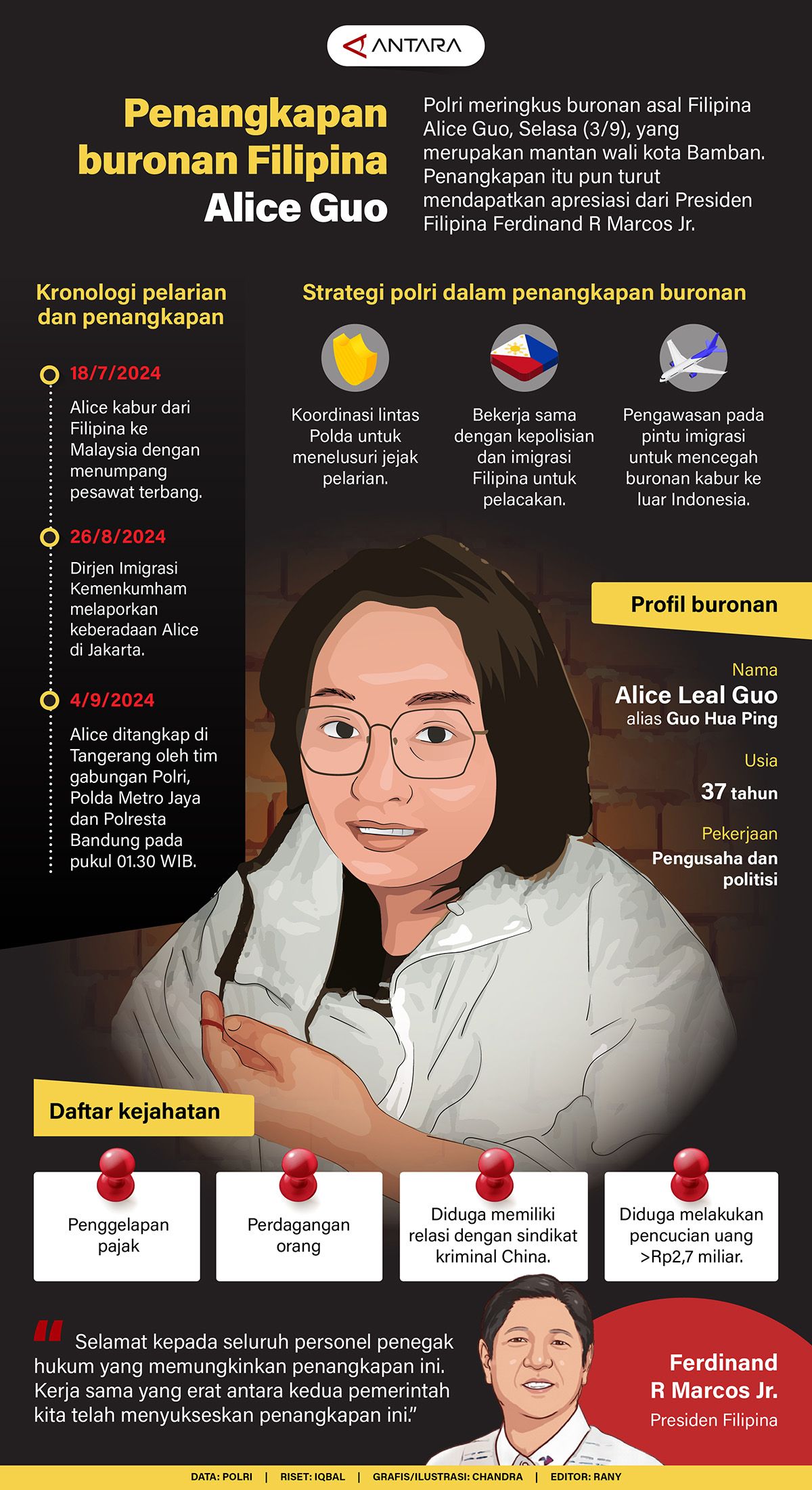 Polri meringkus buronan asal Filipina Alice Guo, Selasa (3/9), yang merupakan mantan wali kota Bamban. Penangkapan itu pun turut mendapatkan apresiasi dari Presiden Filipina Ferdinand R Marcos Jr.