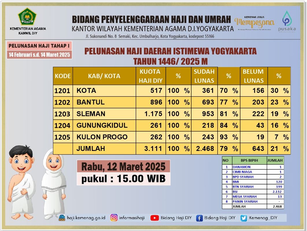 Krjogja.com - YOGYAKARTA – Jemaah haji asal Daerah Istimewa Yogyakarta (DIY) yang mendapat kuota keberangkatan tahun 2025 terus menyelesaikan pelunasan Biaya Perjalanan Ibadah Haji (Bipih). Berdasarkan laporan terbaru dari Kementerian Agama (Kemenag) DIY per Rabu (12/3/2025) pukul 15.00 WIB, sebanyak 2.468 dari total 3.111 kuota jemaah (sekitar 79 persen) telah melunasi biaya perjalanan. Dengan batas akhir pembayaran tahap pertama pada Jumat (14/3/2025), masih ada sekitar 21 persen jemaah yang belum menyelesaikan kewajibannya.