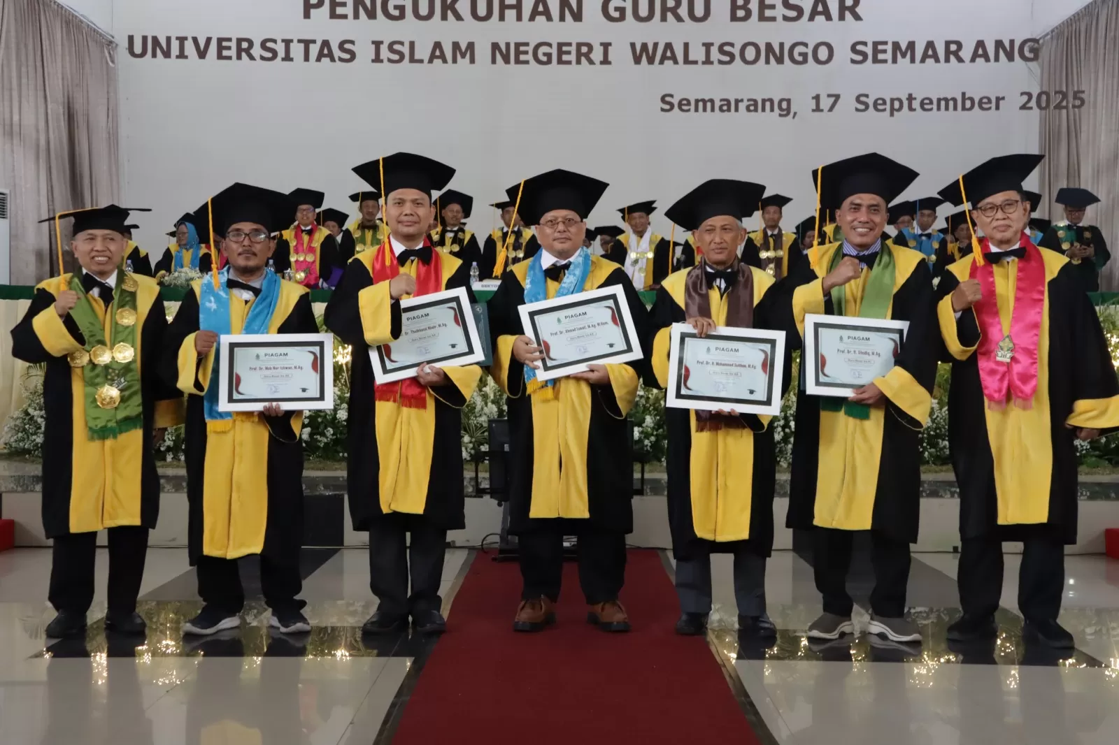 Lima akademisi yang resmi menyandang gelar profesor adalah Prof. Dr. H. Shodiq, M.Ag., Guru Besar Evaluasi Pendidikan Islam; Prof. Dr. Muhammad Sulthon, M.Ag., Guru Besar Manajemen Dakwah; Prof. Dr. Ahmad Ismail, M.Ag., M.Hum., Guru Besar Ilmu Linguistik Arab Modern; Prof. Dr. Tholkhatul Khoir, M.Ag., Guru Besar Ilmu Fiqh; dan Prof. Dr. Moh. Nor Ichwan, M.Ag., Guru Besar Metodologi Tafsir Al-Qur’an.