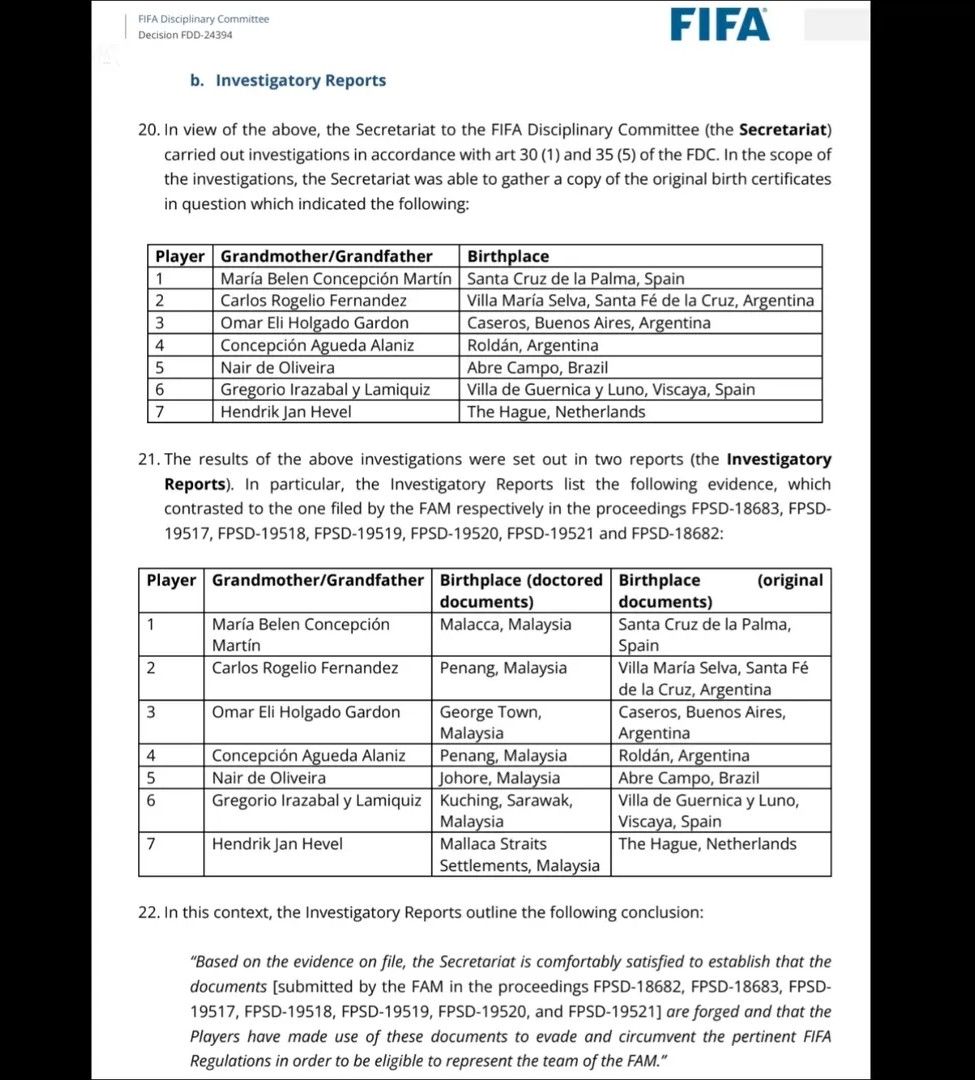 Melalui Sekretariat Komite Disiplin, FIFA berhasil mendapatkan salinan sertifikat lahir kakek-nenek ketujuh pemain yang menjadi dasar proses naturalisasi. Hasil pemeriksaan menunjukkan perbedaan mencolok antara dokumen yang dikumpulkan FAM dan catatan resmi yang ditemukan FIFA.