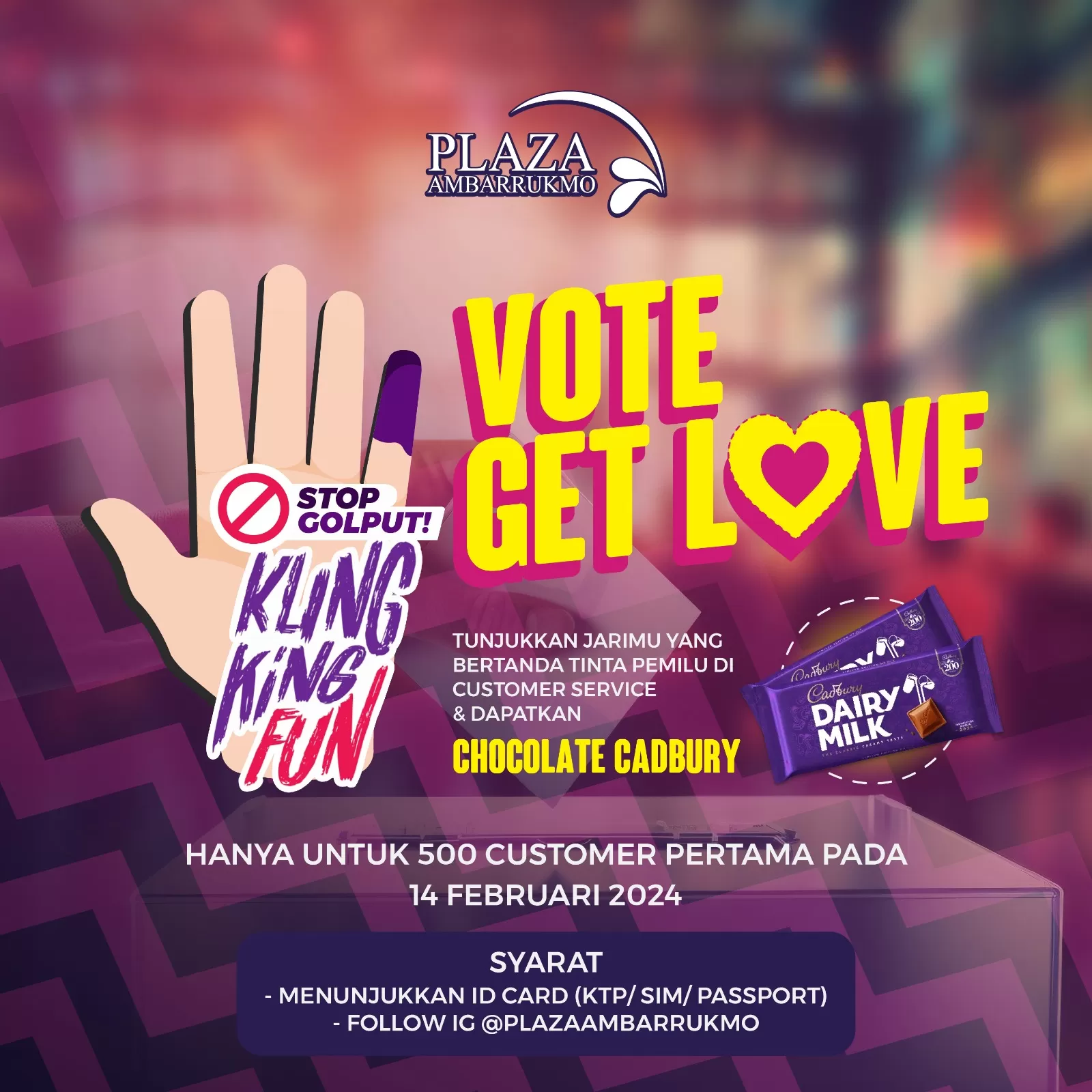 “Vote Get Love” Plaza Ambarrukmo, merupakan program untuk customer yang dapat menunjukkan tinta pada jari kelingking sebagai tanda telah menggunakan hak pilih di Pemilu 2024 serta telah follow IG & Tiktok Plaza Ambarrumo, berhak memperoleh Coklat Cadbury untuk 500 orang pertama yang berlaku pada tanggal 14 Februari 2024 di Customer Service.