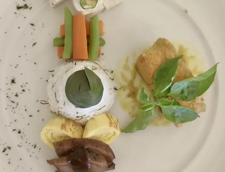 "Untuk pembuka ada Sop Pindang Serani yang ada sejak Paku Alam VII, di sini ada daging ayam atau sapi, kami sajikan sapi. Makanan utama Sekul Ijem dengan daun jeruk. Dipadukan dengan mangut ikan salmon. Ada juga bebek asap dipadu tumis sayuran," lanjutnya.