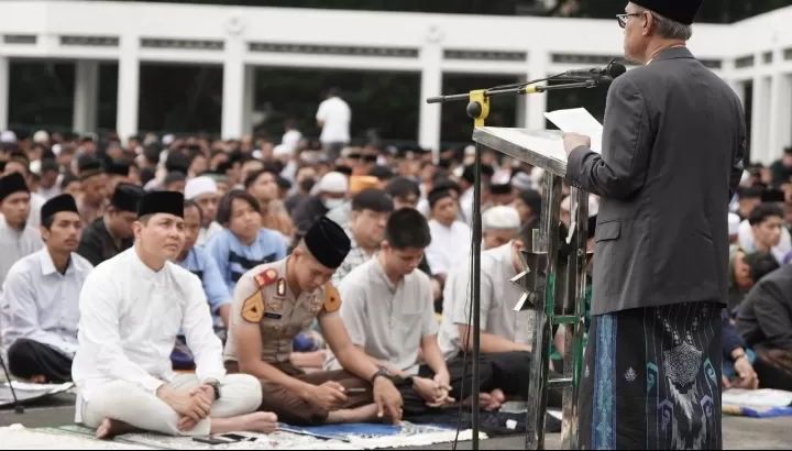 Krjogja.com - YOGYA - Ketua Umum Pimpinan Pusat Muhammadiyah, Prof Haedar Nashir menyampaikan pesan Idul Fitri saat khutbah Sholat Idul Fitri di Lapangan UMY, Rabu (10/4/2024) pagi.