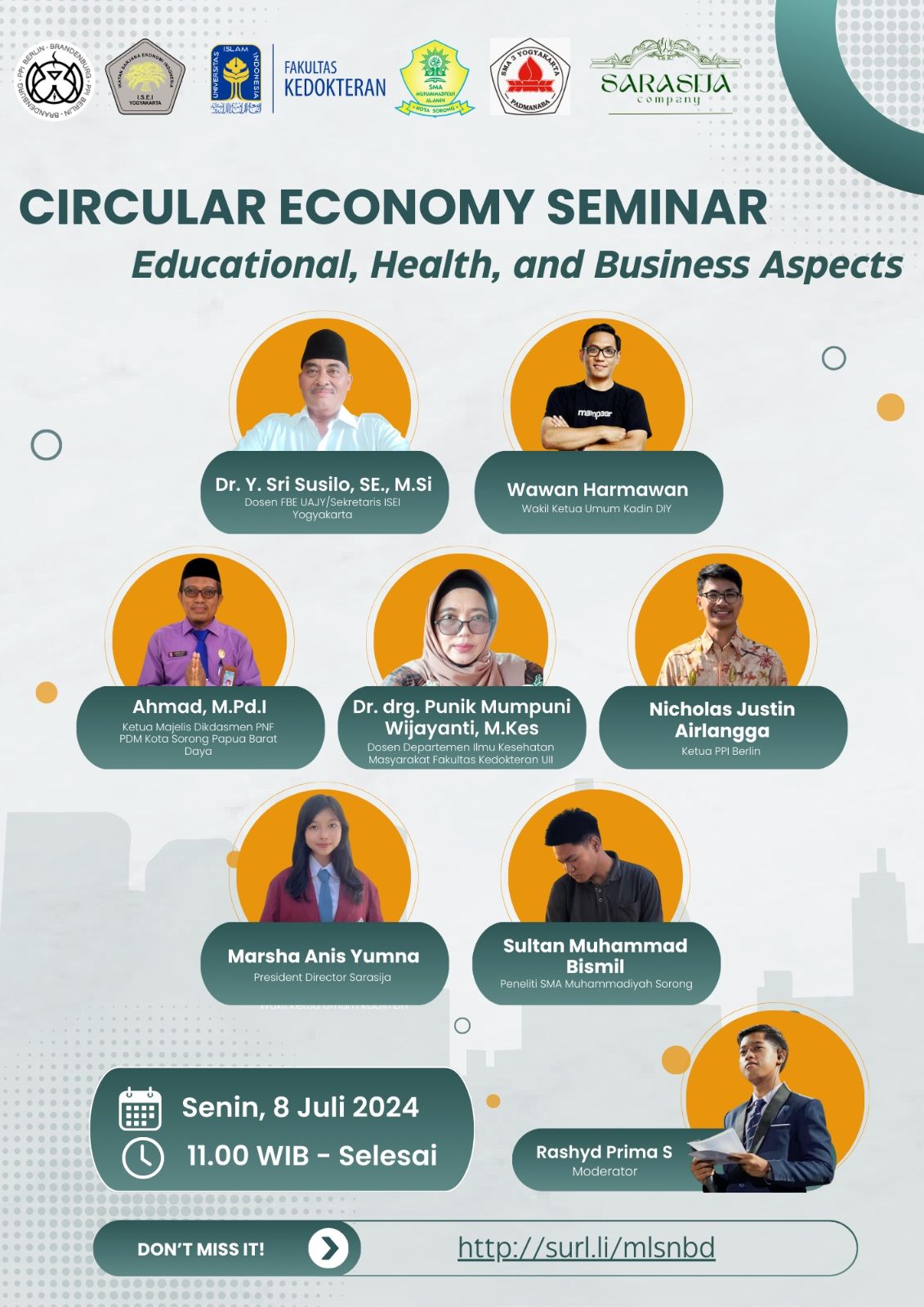 Krjogja.com, YOGYA - ISEI Cabang Yogyakarta bekerja sama dengan Fakultas Kedokteran UII, SMA Negeri 3 Yogyakarta, Kadin DIY, SMA Muhammadiyah Al Amin Kota Sorong Papua Barat, PPI Berlin, dan Sarasija Student Company (SC) menyelenggarakan webinar nasional bertema 'Ekonomi Sirkular: Aspek Pendidikan, Kesehatan & Bisnis', Senin, (8/7/2024).