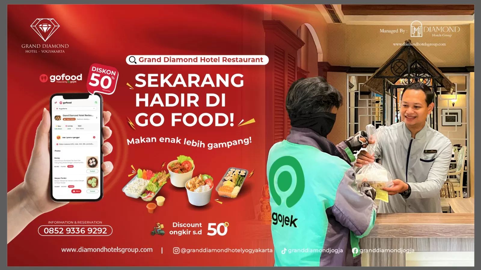 Untuk pemesanan, pelanggan dapat langsung mengunjungi akun GoFood Grand Diamond Hotel Yogyakarta atau menghubungi 0822 2080 0050 untuk informasi lebih lanjut dan reservasi.